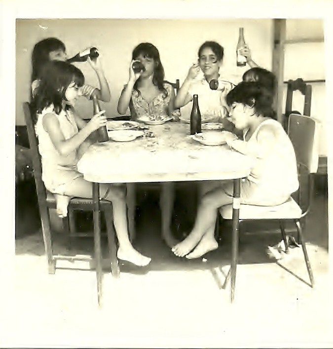 Na casa da Tia Giseuda tinha uma mesa na sala com 8 cadeiras e na mesa da cozinha devia ter mais 6 e mais a mesa lá de traz onde nós as meninas estamos comendo...é que todo mundo muito simples e humilde não se importava de ficar sentado no chão.Sem esquecer o calor!!!Enfim Festa de Ano Novo pra família era sinônimo de liberdade e confraternização!!!E eu vivi isso Graças a Deus!!!!